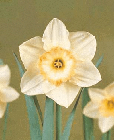 2. Крупнокорончатые нарциссы. Привенчик цветка трубковидный или чашевидный, но немного короче, чем доли околоцветника. Цветки тоже крупные, одно-и двухцветные, причем привенчик, кроме белой и желтой, бывает розовой или оранжевой окраски. Сорта чаще двухцветные: Ice Follis – белый с желтой коронкой (поднадоевший выгоночный сорт), Flower Record – белый с желтой коронкой и красной каймой по ее краю, Fortune – желтый с оранжевой коронкой, Velasgues – желто-оранжевый с красной коронкой, Rose Royalle – белый с розовой невыгорающей коронкой.