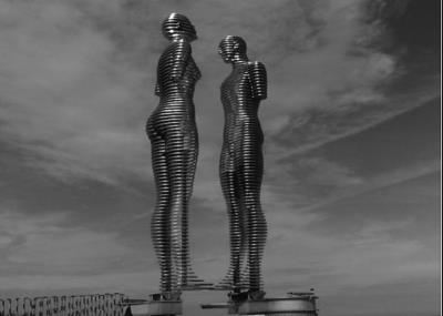 95. При въезде в грузинский город Батуми находится необычная металлическая скульптура, выполненная Тамарой Квеситадзе, под названием «Любовь». Создана она по мотивам грузинского романа «Али и Нино». Скульптура высотой 7 м обошлась городу в 5 тыс. долларов, но примечательна она не только стоимостью и размером. Дело в том, что фигуры парня и девушки непрерывно двигаются, отдаляясь друг от друга и вновь сближаясь, и в какой-то момент они встречаются и сливаются в одно целое.