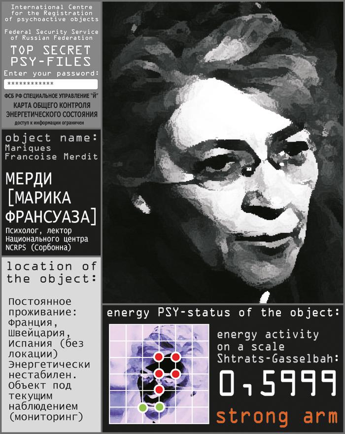 Марика Мерди, профессор Сорбонны и член Парапсихологической академии со штаб-квартирой в Цюрихе, была женщиной невероятных размеров, которые вынуждали поверить в то, что ученым удалось скрестить слона и человека. Волосы ее, даже на вид жесткие, рыжевато-медные, коротко остриженные, но не побежденные, торчали в разные стороны пиками и на лбу выгибались пышной получелкой-тюльпаном; в правом ухе – сразу две платиновых серьги. Могучий торс, руки, не сходившиеся на животе, ноги, напоминавшие колонны варварского храма… Этим ногам, а точнее – огромным уродливым ступням было явно нелегко носить такое тело. Поэтому Марика появилась перед публикой в своем привычном облике: в безразмерном белом пиджачном костюме и босой. Ни одна обувь не могла бы налезть на ее нижние конечности.
