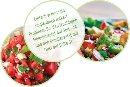 Die meisten Salate, die ich Ihnen in diesem Buch vorstelle, folgen selbstverständlich dem Trend der leichten, modernen Ernährung: Sie können sich daran satt essen und haben dabei das gute Gefühl, Ihrer Gesundheit zu nutzen. Denn Salat ist ja reinstes Superfood: Alles, was Pflanze ist, hat Mutter Natur vollgepackt mit den besten Stoffen für Körper, Geist und Seele. Frische Salatblätter und Kräuter schenken uns sekundäre Pflanzenstoffe für ein stabiles Immunsystem, und zwar weit effektiver als die vielen Pillen und Nahrungsergänzungsmittel, die man uns ständig anpreist. Allein das Grün im Grünen, Chlorophyll nämlich, erhöht die Anzahl der roten Blutkörperchen und versorgt unser Blut mit Sauerstoff – die beste Methode, den Organismus zu entsäuern. Gemüse und Obst, die unseren Salat bunt und wunderbar saftig machen, liefern Vitamine und Mineralstoffe, Fruchtsäuren gelten als Fatburner und lassen die Verdauungssäfte besser fließen. Jedes Öl im Salat ist Vitamin-E-Spender, und speziell Olivenöl enthält Ölsäure für gesunde Blutgefäße, ein starkes Herz und einen ausgewogenen Cholesterinspiegel. Essig oder Zitrussaft regen die Verdauung an, Joghurt im Dressing enthält Calcium für gesunde Knochen, und Nüsse als Topping schenken noch ein Quantum wertvolle Fettsäuren. Welche Menge an wichtigen Vitalstoffen in unseren Salatzutaten steckt, zeigt Ihnen die große Tabelle ab Seite 24. Fazit: Salat ist Vielfalt, und Vielfalt auf dem Teller ist die beste Gewähr fürs Wohlbefinden. Weil's einfach Spaß macht, so zu essen.