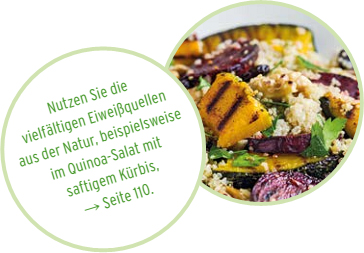 Wer vegan isst, muss ohne tierische Lebensmittel auf sein Eiweiß-Soll kommen, und für uns ist Eiweiß aus Lebensmitteln umso wertvoller, je mehr es in der Zusammensetzung unserem körpereigenen Eiweiß gleicht. Ein Protein, das alle acht lebenswichtigen Aminosäuren in einer Kombination enthält, die unser Organismus ohne Umbau verwenden kann, ist biologisch hochwertig. Als Maßstab nimmt die Ernährungswissenschaft das Hühnerei: Sein Eiweiß entspricht einem biologischen Wert von 100 Prozent. An diesem Wert misst man alle Lebensmittel mit tierischem Eiweiß und natürlich auch die mit Pflanzenprotein: Sojaprodukte erreichen auf dieser Skala eine Wertigkeit von etwa 76 Prozent, Amaranth etwa 75 Prozent, Roggenvollkornbrot circa 68 Prozent, Vollkornreis 64 Prozent, Quinoa etwa 44 Prozent.