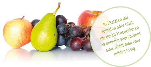 Mit dem Hype um Balsamico und Apfelessig fing es an: Plötzlich entdeckte man, dass Essig weit mehr kann, als Salat sauer machen. Essig gibt Aroma, weil die Säure den Eigengeschmack von Gemüse, Kräutern und Obst unterstreicht. Achten Sie deshalb zunächst auf den Säuregehalt, der auf dem Etikett vermerkt ist: Reis- und Kokosnussessig aus Asien enthalten meist weniger als 5 Prozent Essigsäure, milder Malz- oder Obstessig 5 bis 6 Prozent, feiner Balsamessig maximal 6 Prozent, ausgereifter Sherry- oder Weinessig bis zu 9 Prozent. Nach der Säure richtet sich, welcher Essig zu welchem Salat passt: Kräftige Linsen- und Bohnensalate vertragen mehr Säure als zarte Blattsalate.
