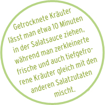 Sie brauchen sich nicht auf die typischen Kräuter wie Dill, Schnittlauch und Rucola zu beschränken, denn im Salat schmeckt jedes Kraut, vorausgesetzt Sie mögen sein ganz spezielles Aroma. Vor allem bei selbst gezogenen Kräutern, die Sie frisch pflücken und sofort verwenden, ist das oft sehr intensiv. Deshalb sollten Sie jedes Kräutlein, das Ihnen noch nicht vertraut ist, erst mal einzeln probieren. Dann können Sie auch richtig kombinieren: Borretsch mit seinem kühlen Gurkengeschmack passt gut ins Joghurtdressing, pfeffriges Bohnenkraut schmeckt in Salat mit Fleisch und Geflügel, während der anisartige Kerbel guter Fischbegleiter ist. Estragon, Rosmarin, Oregano und Salbei entwickeln ihre Würzkraft am besten, wenn man sie brät, Lavendel schmeckt nur in Miniportionen, während Sie mit frischer, würziger Freilandpetersilie gleich einen ganzen Salat mischen können.