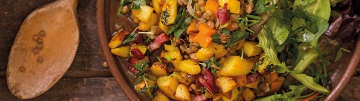 Unser tägliches Essen sollte zum größten Teil aus Pflanzen bestehen. Denn nur darin sind wichtige Substanzen enthalten, die wir regelmäßig brauchen: Ballaststoffe. Diese Präbiotika erfüllen eine Reihe von Funktionen, vor allem aber stabilisieren sie unser Immunsystem, das ganz wesentlich von einer gesunden Darmflora bestimmt wird. Und die Nahrung dieser Darmflora sind zum größten Teil Ballaststoffe. Das heißt, je besser das Futter für diese winzigen Helfer, desto besser geht es uns: Körper, Geist und Seele profitieren vom gesunden Leben in unserem Bauch. Deshalb müssen wir viel Gemüse, Vollkorn, Hülsenfrüchte, Kräuter und Obst essen, also all die Zutaten, mit denen wir unseren Salat mischen. Auch Kartoffeln sind optimale Ballaststoff-Spender, dazu für viele Menschen leichter verdaulich als Vollkorngetreide und zudem reich an pflanzlichem Eiweiß, das in Verbindung mit Käse, Joghurt, Schmand oder Ei auch besonders wertvoll für die Ernährung ist. Den Ballaststoffgehalt können Sie sogar noch steigern: Bei frisch gekochten Kartoffeln liegt die Ausbeute für den Organismus bei etwa 3 Prozent, bei gekochten und dann gebratenen Kartoffeln sogar bei 12 Prozent. Der Grund: Wenn Kartoffeln oder auch Nudeln und Getreide gegart und abgekühlt werden, entsteht sogenannte resistente Stärke, die nicht wir, sondern nur unsere Darmflora nutzen kann. Damit Sie das praktisch testen können, finden Sie auf Seite 127 ein ungewöhnliches Rezept: Salat aus Bratkartoffeln.