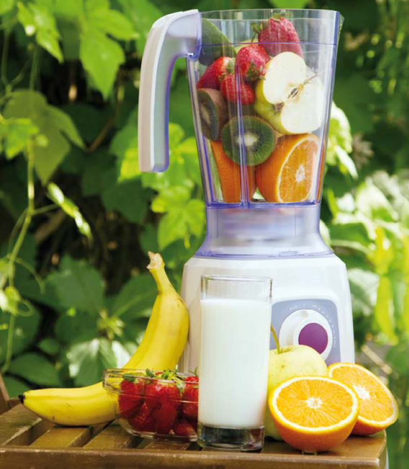 Für flüssige und cremige Smoothies mit Obst und/oder weichem Gemüse eignet sich ein kleiner Handmixer mit zwei unterschiedlich großen Mixbechern am besten. Auch eine grob zerkleinerte Möhre, Nüsse und Schokolade lassen sich darin mit den anderen Zutaten zerkleinern; Portionsmengen von tiefgefrorenen Früchten machen ebenfalls keine Probleme. Auf die gefüllten Becher schraubt man das Kreuzmesser und setzt es auf den Motor. Der Becher ist nun so fest verschlossen, dass nichts auslaufen kann. Trinken können Sie den fertigen Smoothie ebenfalls gleich aus dem Becher. Oder mit dem passenden Schraubdeckel wieder verschließen und als Pausensnack mitnehmen. Kreuzmesser und Becher sind mit einer Flaschenbürste rasch und leicht gereinigt. Den großen Mixer brauchen Sie, wenn Sie häufig Smoothies mit Hartem und Faserreichem mixen wollen: zum Beispiel größere Mengen von Eiswürfeln, dicke Ananasstücke, rohe Rote Beten, Knollensellerie oder Kohlblätter. Mit einer Intervallschaltung können Sie Eis gut zerkleinern. Oder den Grad des Pürierens besser steuern: Vielleicht mögen Sie den Smoothie auch mal mit Fruchtstückchen zum Löffeln.