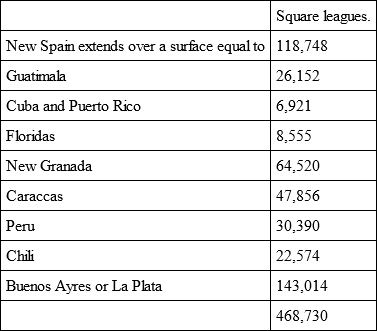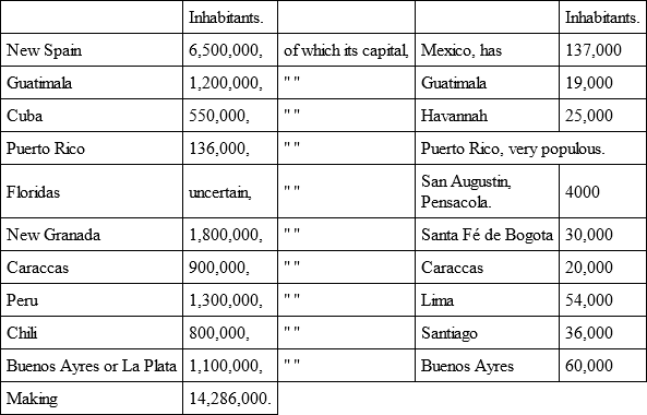 To which may be added 50,000 more for Cuba, as according to the latest enquiries that island possesses a population of 600,000 souls; thus there will be a total known population of 14,336,000, and allowing for the inhabitants of the Floridas, and the unnumbered Indians of the kingdom of La Plata, the actual number of persons existing under the government of Spain in the Americas, will not fall short of fifteen millions, while the Portuguese subjects in Brazil amount only to 3,300,000, of whom one million and a half are negroes, one million are Indians and the rest whites.