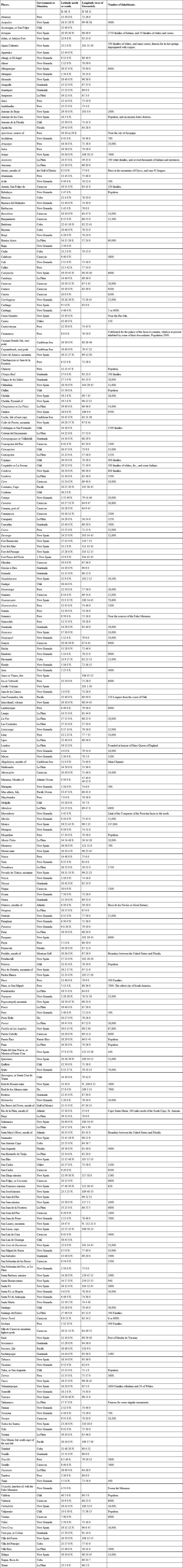 TABLE OF THE LATITUDES AND LONGITUDES OFSOME OF THE PRINCIPAL PLACESIN SPANISH AMERICA, CORRECTED FROM THE LATEST INFORMATION,WITH THE NUMBER OF INHABITANTS IN THE CHIEF TOWNS