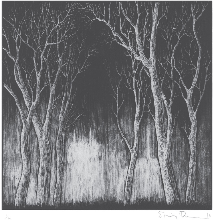 The artwork features colourful paintings of trees fronting dark woods beyond, strange multi-limbed creatures and lurking, vaguely glimpsed monsters.