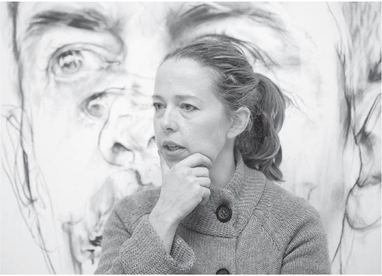 The ground floor of the studio consists of a single open room stretching from concertina doors at the front to multi-paned windows at the back. Jenny’s drawing studio takes up about a quarter of the floor space – a curtain of clear plastic sheet hangs down to divide this portion off and contain the warmth of two electric fan heaters which buzz and tick beside us now as we stand, surrounded on three sides by large charcoal drawings of mother and child. Inspired by Leonardo da Vinci,* each cartoon is over-drawn to depict multiple scenes, like a triple-exposed film – the figures frozen in three acts. My eyes pick up and follow a line, a leg or a hand, and then recognise the rest of the drawing to which it belongs before skipping over to another detail or action. It’s quite disorientating and in these moments the babies seem to be multi-limbed and flailing … and I realise, standing there, how quickly I’ve taken for granted how mind-blowing Jenny’s work is because I’m describing it as disorientating and hypnotic when what I should be telling you is what it’s like to stand with an artist in the space where she creates work that I imagine would delight the pillars of the Renaissance. It’s shock and awe. It’s awesome and very moving … and I don’t want to jump ahead and spoil the end but I wasn’t able to revisit Jenny after this meeting and that aspect of this chapter – it being a unique four-hour encounter – means the details are rendered rich and vivid in my mind. We got a lot done, talked and walked around before the work, peered close where the paint became a livid landscape and smelt of sour gummy turps and stood back where the apparently disparate shards and pocks of paintings focused to form these remarkable wholes. We drank tea. We spoke about Duncan Jones’s film Moon, W.G. Sebald’s De Emigrés and I told Jenny about G.K. Chesterton’s essay ‘A Defence of Skeletons’* and then it was over and I was back out on the street and everything was prosaic by comparison for a long time afterwards, the focus and colour lost – as if I’d been drinking tea with a phoenix and now had to go back to rubbing two sticks together.