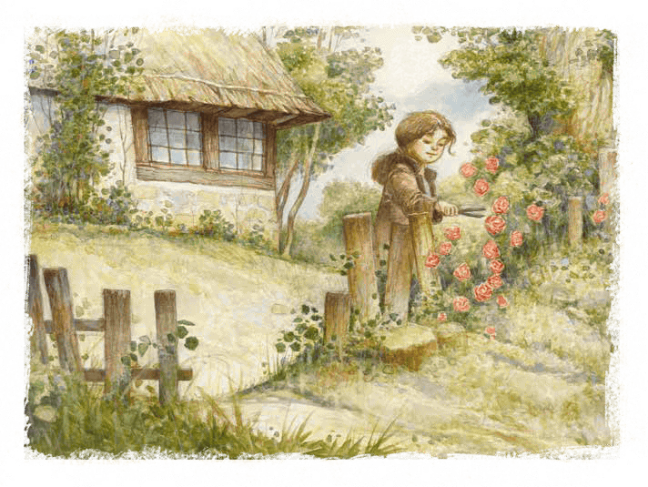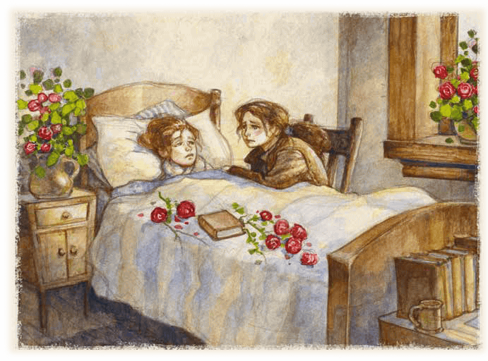Срезав цветы и положив их в корзину, Лаванда направилась к дому Розы. Она застала подругу спящей. Её мать сидела рядом, наблюдая за дочерью. Лаванда передала цветы миссис О'Брайен, чтобы та поставила их в воду. Мама Розы тихо приобняла Лаванду, и вместе они наблюдали, как девочка спит.
