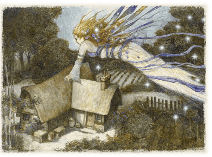 Часы пробили двенадцать. Луна поднялась над холмами, освещая лицо девочки. Вдруг где-то вдалеке загорелась маленькая звёздочка и полетела к окну Лаванды. Звёздочка всё росла, пока не превратилась в маленькую лесную фею. Она влетела в окно Лаванды, плавно прыгнула к ней на плечо и откинула одеяло, чтобы увидеть бутон розы. Личико феи засветилось, она взмахнула рукой, и бутон рассыпался на тысячи золотых искр, а после превратился в серебряное ожерелье с кулоном. Фея осторожно сомкнула пальцы Лаванды вокруг него и поцеловала девочку в щёку. А потом выпрыгнула в окно и полетела в ночь, исчезая во тьме таинственного леса Галти.