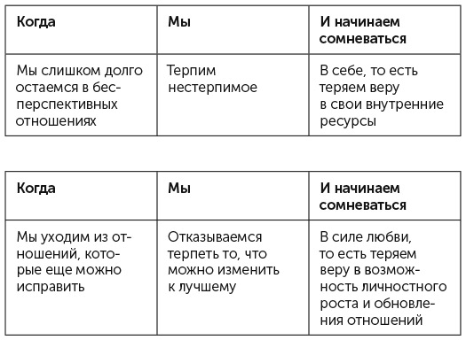 Порой наставления, услышанные в детстве, заслоняют нам истинное «я» и реальное положение вещей: «Выживай, все обдумывай, будь как маленький паровозик из сказки, у которого все получается, молчи и терпи, не будь слабаком, никогда не сдавайся, что бы ни случилось». Упорство и настойчивость, безусловно, положительные черты, но иногда именно они не дают выйти из тупика. Не следует винить себя за то, что собственная жизнь для вас – потемки. Трудно разобраться, что делать, когда не готов к действиям, и это можно понять. Знание и действие должны сойтись с готовностью – это и будет подходящий момент. Необходимость уйти очевидна лишь тогда, когда вы готовы это сделать. Знание – это принятие и открытость, ведущие к готовности.