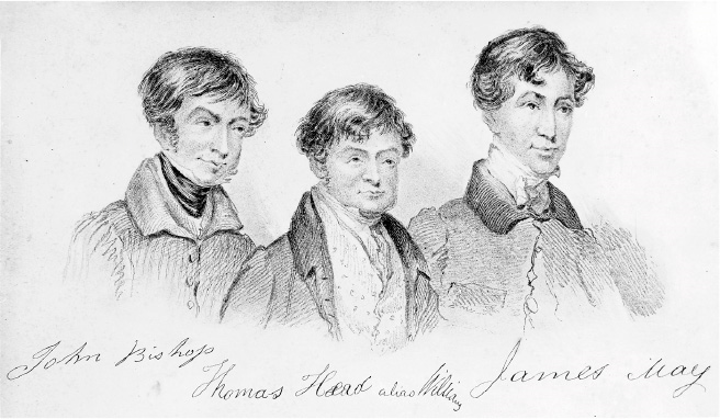 Рисунок 1831 года, изображающий Джона Бишопа, Томаса Уильямса и Джеймса Мэя – «лондонских бёркеров»