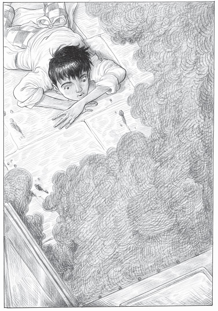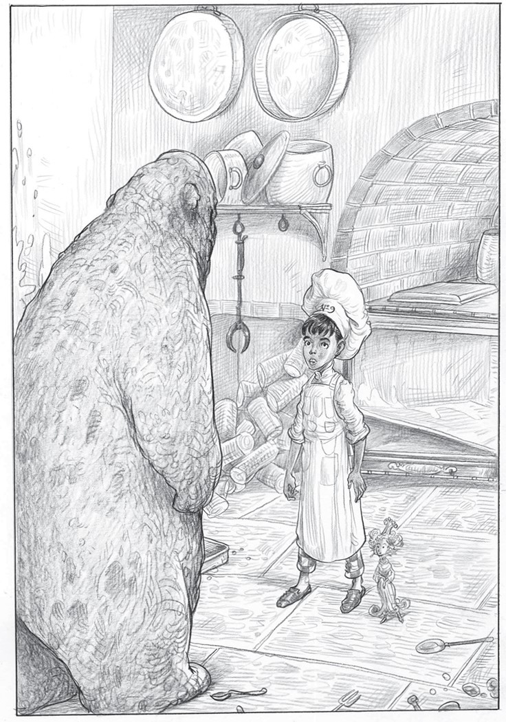 Зам пригнулся и бросился на пол, чтобы избежать столкновения с вылетевшим из духовки раскалённым противнем. Когда мальчик упал, то почувствовал, как его пальцев на мгновение коснулась гладкая сальная шерсть. Бах-бах-бах! – последовала серия оглушительных ударов: это противни приземлялись в разных частях кухни. Повсюду клубился дым, сверху сыпался дождь из пряничных крошек.
