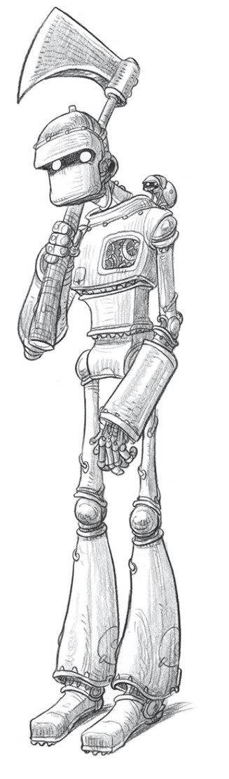 Подле жаровни высилась куча деревянного хлама – кроватные ножки, расщеплённые половицы, сиденья стульев. Порцией этих обломков уже предусмотрительно начинили жаровню. Груду эту охраняли два высоких человека, сделанных из железа. Глаза их горели в полумраке подземелья. В их металлические грудные клетки были встроены стеклянные панели, сквозь которые Заму удалось разглядеть движущиеся шестерёнки и пружины, напоминающие часовой механизм. Железные люди, подобно дровосекам, держали в руках топоры ужасающих размеров. На плече у каждого сидел жук медного цвета. Глаза жуков светились так же ярко, как и глаза металлических громадин.
