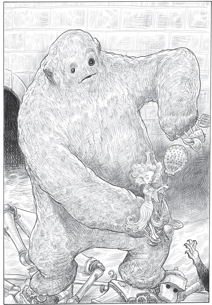 После этого Пряничище повернулся к Принцессе из Сахарной Ваты и закачался из стороны в сторону, топая ногами. Опять полетели крошки, и на рыхлом лице его нарисовалась трещина, напоминающая улыбку. Пряничище моргнул тёмными глазами, раскрыл рот, и оттуда вылетел странный треск – словно по тарелкам с пудингом скребли десертными ложечками.