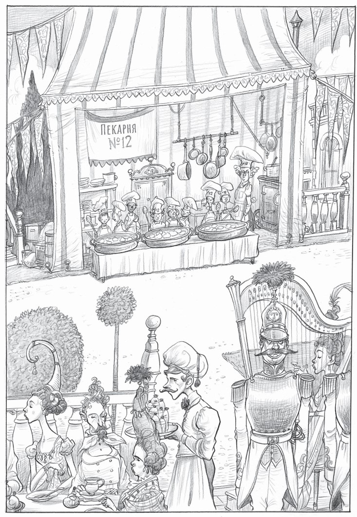 На лужайках дворцового парка хлопотали все пекарни Траутвайна. Перед шатрами из полосатого шёлка, украшенными бархатными флажками, расставляли на длинных столах подносы с румяными пирогами и нежнейшими пирожными. Подмастерья Пекарни Номер Двенадцать ухмыльнулись, когда Зам с товарищами проходили мимо их столов. Там в золотых чашах по озёрам тягучего сиропа плавали изумительной красоты сдобные острова, на которых возвышались холмы заварного крема.