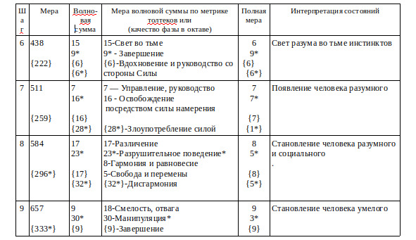 Со стороны Силы, т.е. со стороны Луча Творения на шаге 6 мы имеем {222}. Число 2 имеет качества «Предназначение, знак судьбы. Покорность, смирение и понимание». Кроме того, с точки зрения положения числа 2 в октаве оно имеет свойства развития без сопротивления импульсу начала цикла 1. Таким образом, здесь 222 – это свободное без сопротивления развитие программы эволюции согласно Предназначению.