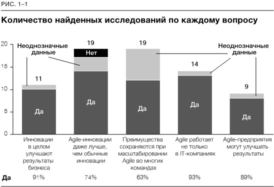 В целом, мы были воодушевлены тем, что нашлось так много эмпирических данных. По нашему мнению, это убедительное доказательство того, что использование Agile на уровне команды и при масштабировании до уровня предприятия способствует улучшению результатов (Рис. 1–1). Даже без контроля качества выполнения Agile или отбрасывая неудобные точки ввода данных мы находим мало исследований, предполагающих, что Agile-подходы в среднем вредят результатам. Вот наши более конкретные выводы: