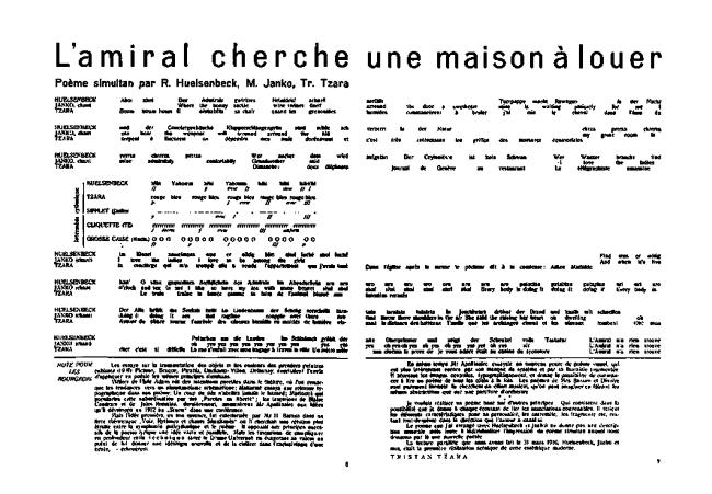 Симультанное стихотворение Р. Хюльзенбека, М. Янко и Т. Тцара “L’Amiral cherche une maison à louer” («Адмирал ищет дом в аренду», фр.) из сб. «Кабаре Вольтер» (1916)