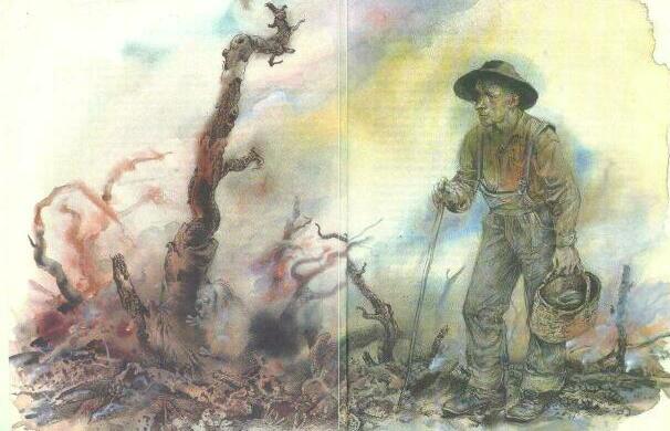 Он всё ещё продолжал плакать и, потеряв всякую надежду, прижался к почерневшему, растрескавшемуся стволу молодого дерева. Тогда его заметил человек в тяжёлых башмаках и грубых штанах. У человека в руках была корзина со старыми вещами. Осторожно прокладывая себе путь по белому горячему пеплу, оставшемуся от сожжённых деревьев, он возвращался домой на другую сторону полуострова. Он улыбался, испытывая жалость, удивление и радость одновременно, когда, оторвав Ушастика от ствола дерева, посадил его осторожно в свою корзину.