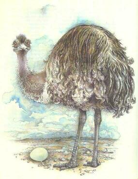 Затем эму-отец снова сел на яйца, укрыв дрожащего птенца от сильного ветра взъерошенными перьями. Только что вылупившийся птенец совсем не походил на своих родителей. Шея у него была короткая, а всё тело забавно покрывали коричневые и белые пятна. Хвоста у него не было.