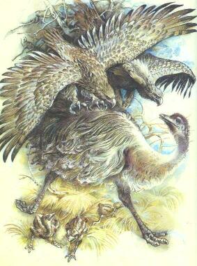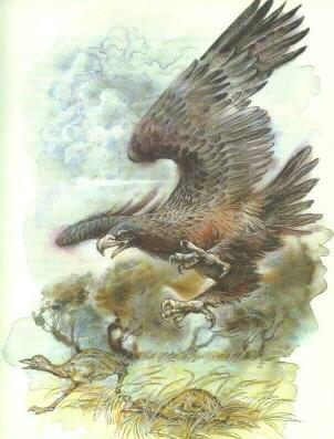 Вдруг два огромных острохвостых орла точно упали с неба: хищные клювы крючком, крылья раскрыты, когти рвут воздух, глаза прикованы к семейству эму.
