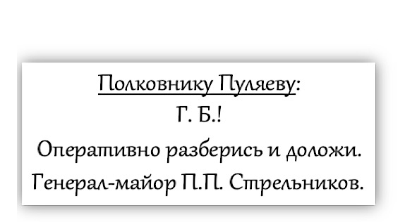 В этот раз поверх аккуратной стопки бумаг находилась тонкая серая папка с двумя белыми завязками. Полковник развязал завязки – ать-два! – открыл папку, сказал «Так!», потом сделал глоток чая, поставил стакан в подстаканнике на стол и вынул из папки документ в виде нескольких рыхлых страниц, сколотых стальной скрепкой. В верхнем углу был приклеен плотный листок—«бегунок», на котором размашистым почерком генерала, толстыми голубыми линиями чернильной авторучки было написано: