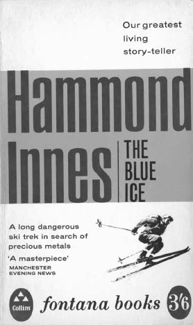 It was possible around 1965, for example, to spot an Alistair MacLean paperback from quite a distance. Just over half the cover would be a solid colour on which was printed the author’s name (often the ‘Alistair’ was in black and the ‘MacLean’ in white) and top right would be the title, in type half the size of that used to identify the author. The bottom section of the cover would be a photographic image cut out on a white background, to suggest the story but nearly always showing a man holding a gun or perhaps an ice-axe. The same principle, from the same paperback publisher Fontana, applied to new editions of the work of Hammond Innes. They would have a block of background colour striped across the centre of the cover with the author’s name in a darker shade and the title in a (much) smaller font. There would be one illustration below the title and a related image on the back cover. For example, the 1966 edition of The Blue Ice had the image of a lone skier on the front, suggesting a trek across country rather than ‘Ski Sunday’, and the rear cover photograph was a dramatic one of a man (possibly the skier) with his mouth and beard obscured by ice. The avid fan knew immediately that this was one of Innes’ man-against-the-frozen-elements adventures – much of it is actually set on a glacier in Norway – and nobody seemed to mind that the book had been written in 1947 and had first appeared in paperback in 1954. By the Sixties, Hammond Innes and Alistair MacLean were recognisable brands of a particular type of adventure story and their paperback covers were ‘branded’ to make them stand out on the bookshelves from the growing competition.