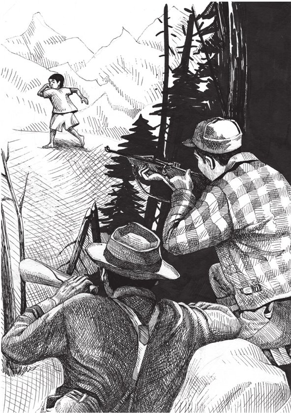 Уларнинг иккаласининг ҳам елкасида милтиқлари бор эди. Мен бу пайтда олти ёшдан ўтиб қолган бола эдим. Бир маҳал иккаласи мени кўрди-ю, бири-бирига қараб: “Анавини қара, бу ким-а, маймунми, айиқ боласими ёки одам боласими?” деб елкасидан милтиқларини олиб ўқлай бошлашди. “Бу ерда, бир тоғ орасида одам боласи нима қилади, отиб олсак кейин биламиз”, – дейишди. Қарасам отадиган, мен шоша-пиша қўрққанимдан тезда ўрнимдан сакраб туриб бор жон-жаҳдим билан жоним борича югуриб қочиб қолдим. Шунчалик тез югурдимки, бир зумда кўздан ғойиб бўлдим. Улар мени отишга улгуришмади. Орқамдан қанча вақт ва қаергача қувишди билмайман. Лекин топиша олмади. Худонинг ўзи бир сақлади. Ажалим етмаган экан. Мен улар етиб олса мени отиб ўлдириб қўяди, деган қаттиқ қўрқув натижасида сой бўйлаб тўхтовсиз югурардим. Анча вақт ўтгач йўлдан адашиб қолдим. Қоронғи туша бошлади. Қаттиқ изғирин шамол эса бошлади. Кун ҳам совуб кетди. Қаттиқ шамол таъсирида арча ва дов-дарахтлар шовиллаб овоз чиқарар эди. Эски, қуриган шох-шаббалар қарсиллаб синиб ерга тушарди.