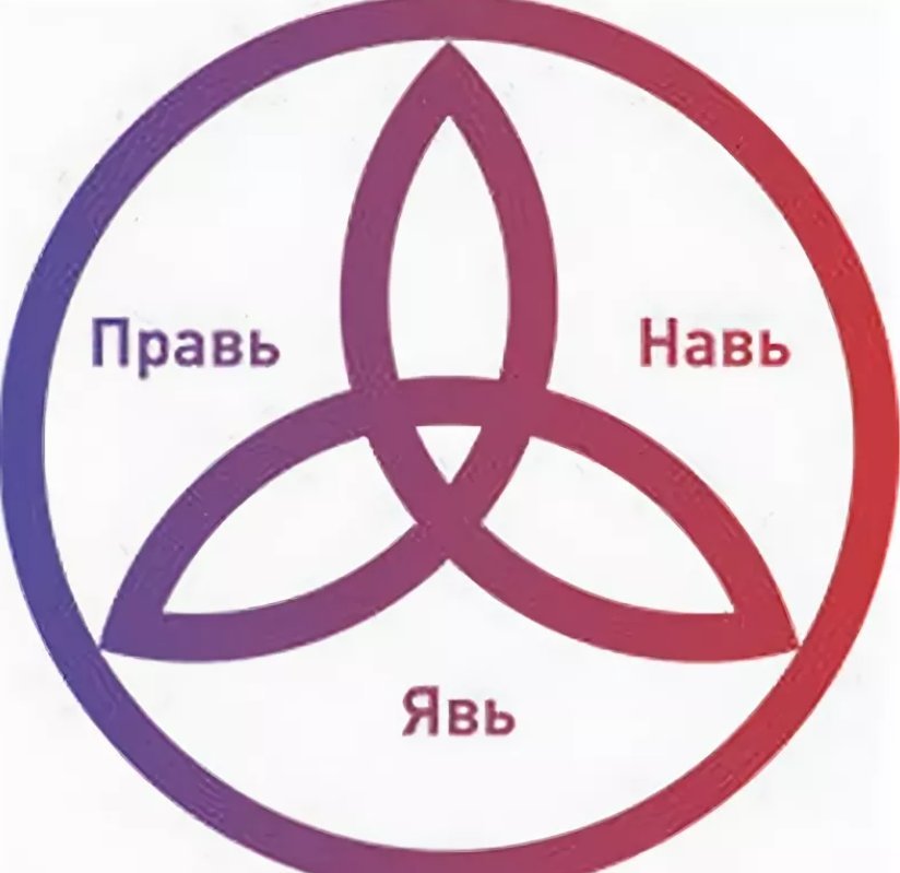 «Существует три мира: Явь – мир людей и живых существ; Навь – мир духов и бесов; Правь – мир богов; Славь – мир предков и покровителей рода, пересекает все остальные три мира. Явь, Навь, Правь изображаются как трилистник, а Славь – круг, в котором этот трилистник находится».