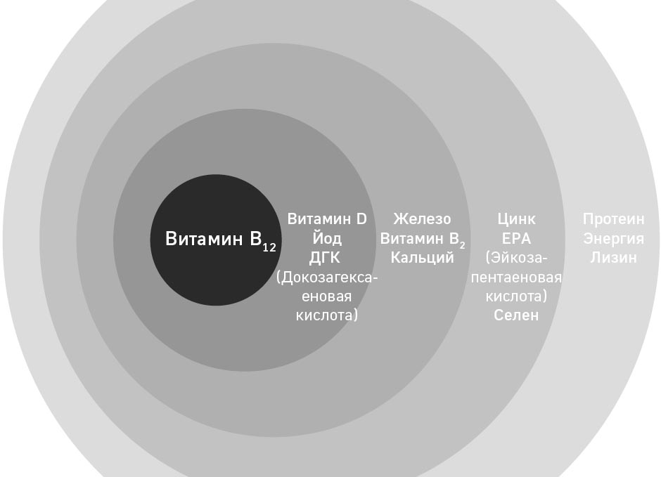 В центре рисунка находится витамин В12, который является наиболее редким питательным веществом в растительном рационе. Чем дальше от центра расположено питательное вещество, тем легче удовлетворить потребности в нем с помощью веганской диеты. Немецкое общество питания (DGE) или другие профессиональные сообщества, занимающиеся вопросами питания, не относят все остальные питательные вещества, не представленные на рисунке, к критически важным для веганского рациона. Такие питательные вещества априори представлены в необходимом количестве в рамках сбалансированного питания веганов с подсчетом калорий. Как будет показано в следующих разделах, теоретически потребность во всех этих важных питательных веществах можно полностью удовлетворить за счет потребляемой пищи. Однако на практике наиболее важные из них, такие как витамин B12, поступают в организм в виде пищевых добавок, поскольку растительные источники либо еще недостаточно изучены, либо не всем доступны.