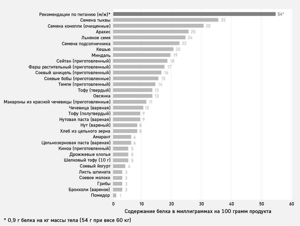 На рис. 4 представлена информация о содержании белка в ряде богатых им растительных источников, при этом содержание белка в обычных сухих продуктах, таких как бобовые и зерновые, уже пересчитано на содержание в вареном виде. Это дает первоначальное представление о том, какие растительные продукты особенно подходят для удовлетворения суточной потребности в белке.
