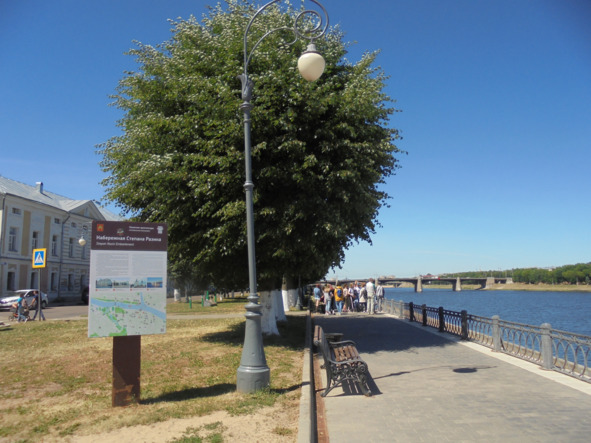 Итак, мы вышли на набережную Степана Разина, которая, как пишут, является памятником градостроительства с сохранившимися зданиями XVIII века, застроенными «сплошною фасадою». Степана Разина в Твери не было, а двухэтажные здания екатерининской эпохи стоят, в них даже еще обитают, правда, большей частью юридические конторы, трактиры и т. п. Екатерина II Тверь посещала, она участвовала в планировке города после большого пожара 1763 года, отсюда она водным путем путешествовала в «Синбирск» в 1767 году, она построила в Твери путевой дворец (на пути из Москвы в Санкт-Петербург), в котором останавливалась 8 раз.