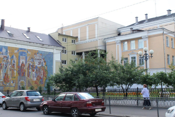 Вернемся в центр, мы там еще не все рассмотрели. Это часть Трехсвятской. Это гимназия №12. Своя территория маленькая, но уютная. Еще и кусок стены с мозаикой ей достался. Это центр Тверского проспекта, если смотреть в сторону площади Капошвара – за ней по прямой в 800 м ж/д вокзал. Ну а тут – Тверской проспект и Новый мост на горизонте.
