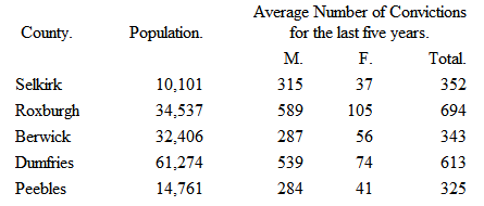But lawless as the Borders may have been in the olden time, they certainly do not at the present day bear many traces of their evil past. The Border counties, judging from the statistics of the Police and Sheriff Courts, have an excellent record, whether we consider the number or the nature of the cases dealt with. The following statistics speak for themselves: —
