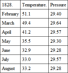 The following Table shews the mean temperature and pressure as registered at the Observatory at Port Famine in the Strait.