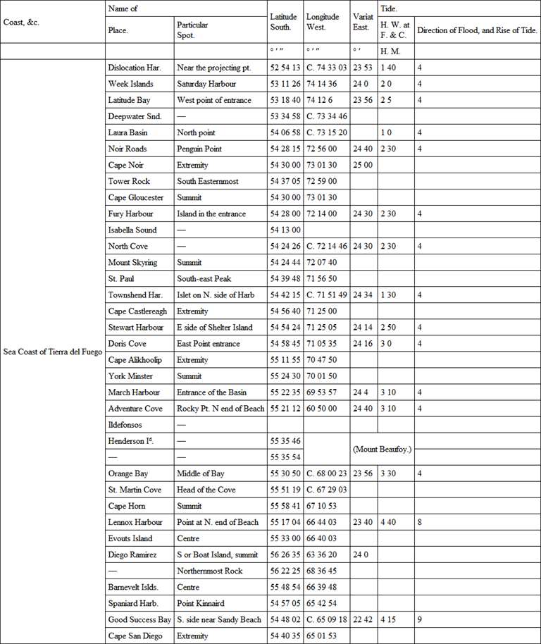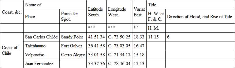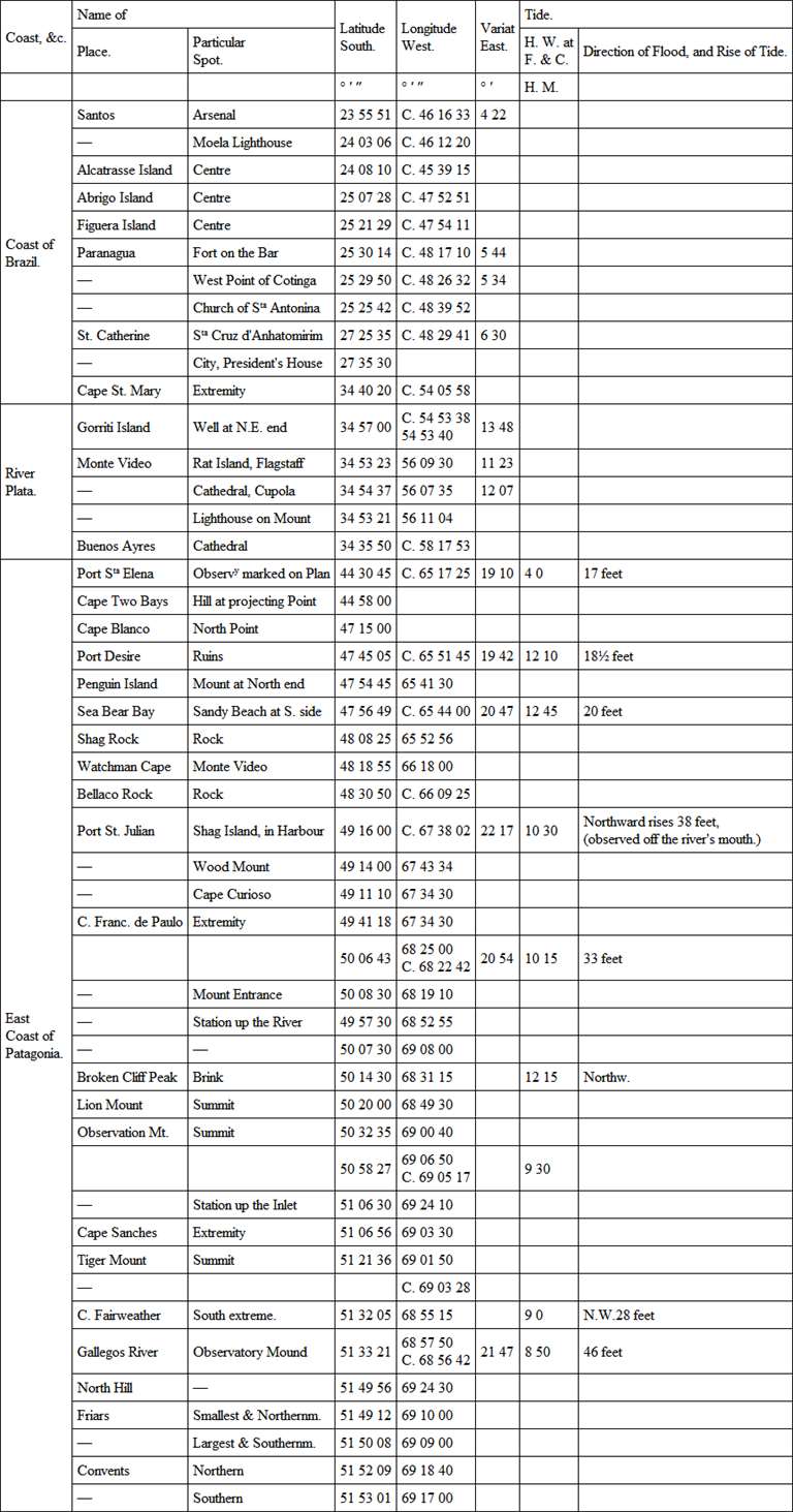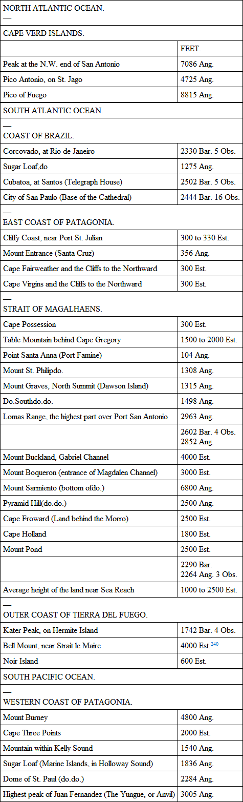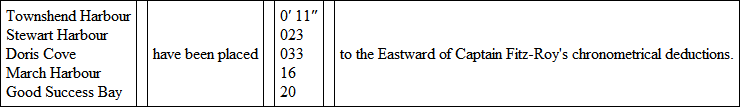 In order to adapt the longitudes of the places mentioned in this Table to the meridians of Port Famine and St. Martin Cove, at Cape Horn, the following corrections239 have been made to Captain Fitz-Roy's chronometrical results, viz: —