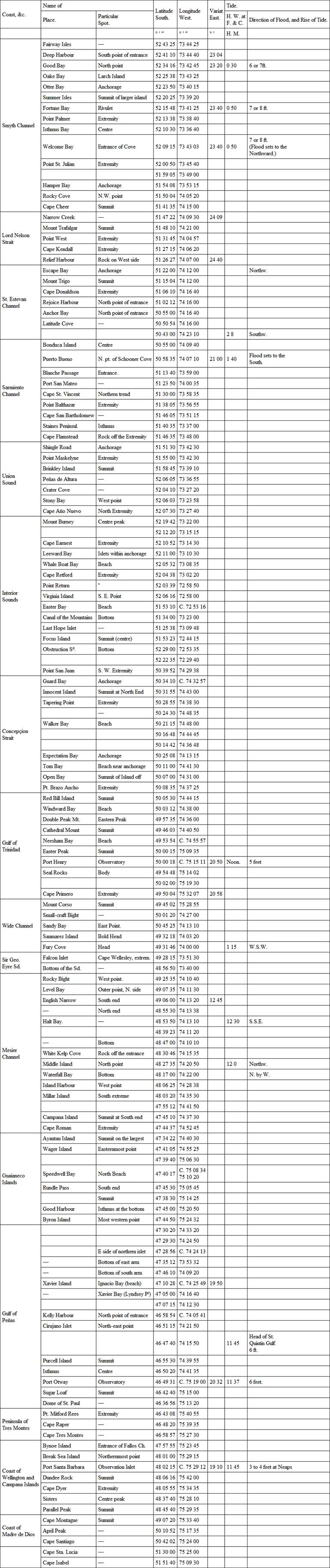 TABLE III—THE WESTERN COAST, AND INTERIOR SOUNDS,FROMTHE STRAIT OF MAGALHAENS TO THE NORTH EXTREMITY OF THE GULF OF PEÑAS