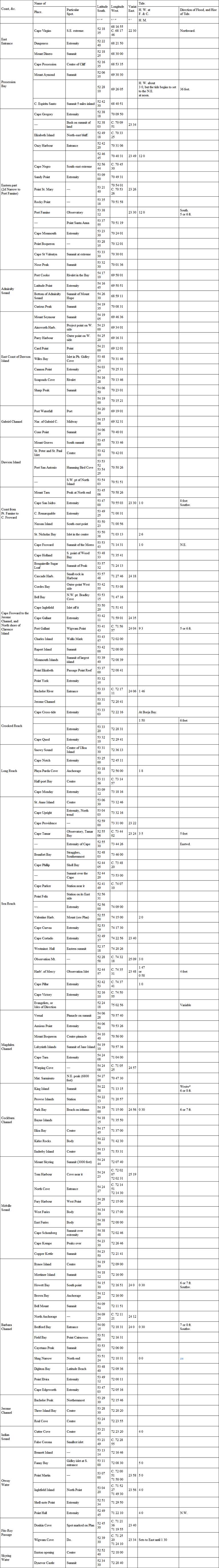 The Longitudes in the following Tables depend upon that of Villegagnon Island at Rio de Janeiro, which was found by fourteen Chronometers from Plymouth to be 43° 05′ 03″ West of Greenwich.