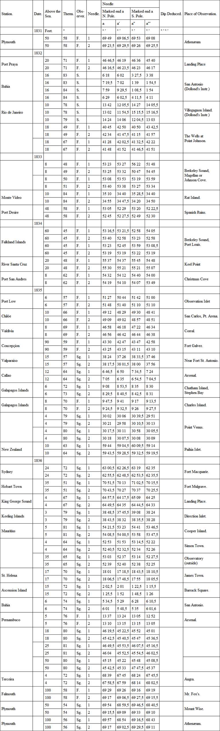 The voyage which Captain Fitz-Roy had to perform promised to furnish few, if any, such opportunities of examining the state of the magnetism of the cylinder, between the departure from and the return to England; and, – as it cannot but be extremely discouraging to officers to make observations which they have reason to apprehend may prove unavailing from defect in the instrument employed, – it must be regarded as exceedingly creditable to Captain Fitz-Roy and his officers, that, with the knowledge of the change which the cylinder had undergone in the preceding voyage, they persevered in diligently observing, and carefully recording, its time of vibration, at most of the principal ports which they visited in their voyage of five years' duration. Nor was it until their return to the Cape Verd Islands, in September 1836, that they could infer, from observations repeated at the same spot as in their outward passage in 1832, that the cylinder had not varied in any thing like the degree that it had done in the preceding voyage, and that the care and pains they had bestowed were therefore likely to be recompensed by success.