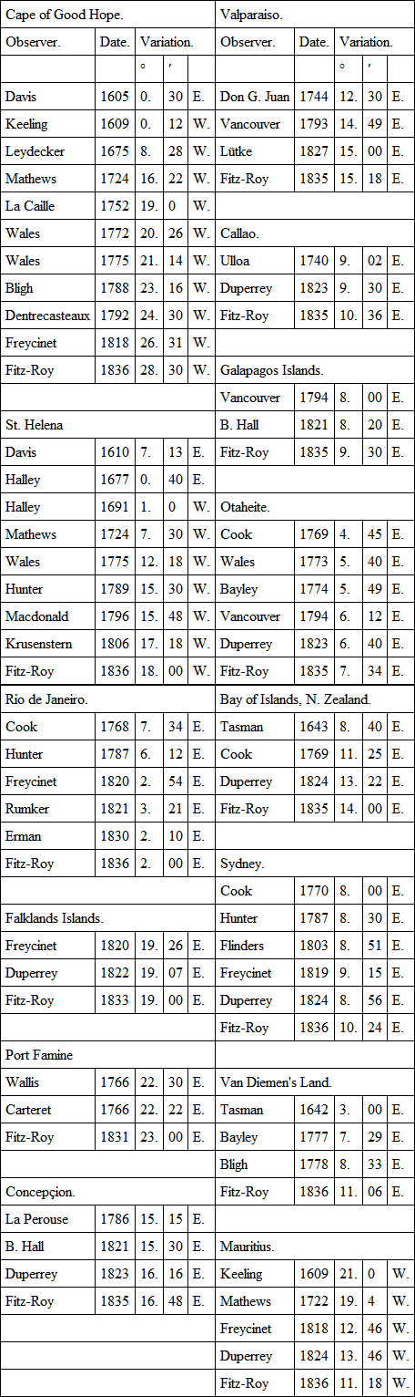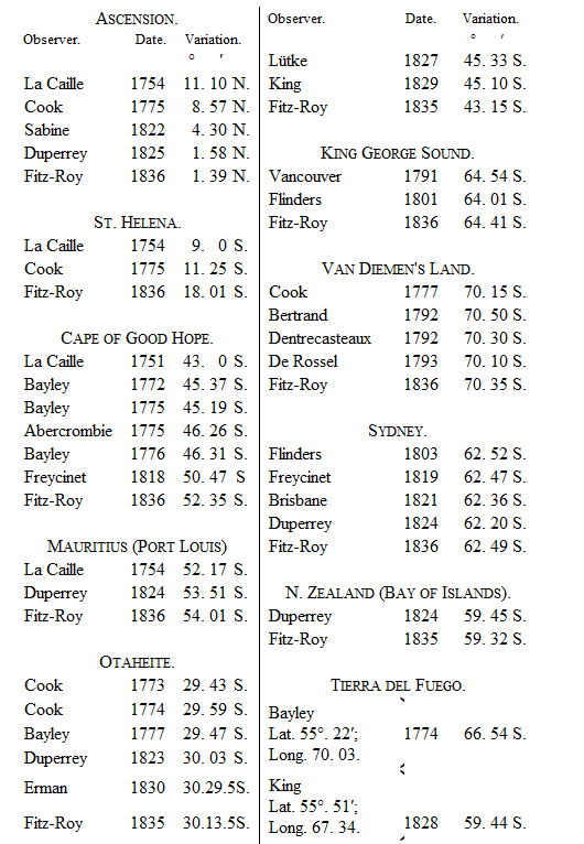 [The variation at Ascension (13° 30′ W.) is correctly inserted in the tables: it is the only one of Captain Fitz-Roy's stations at which his observations are not accordant with those of other observers: the discordance may be occasioned by the great prevalence of local disturbances at Ascension.]