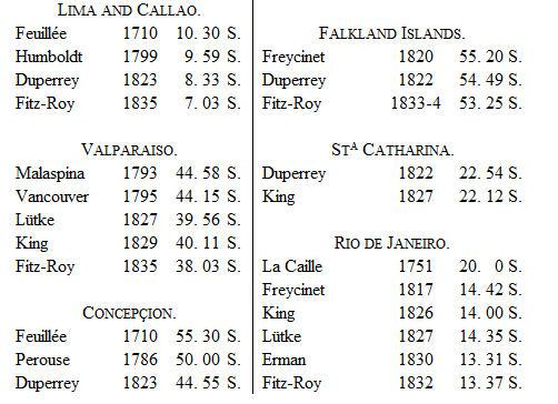 II. DipThe following table exhibits the comparison of Captain Fitz-Roy's observations of the dip in the southern hemisphere, with those of earlier observers, at stations where the materials for such a comparison exist.