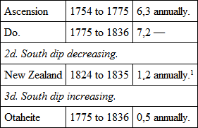 As the south dip decreases in South America, and increases in Africa, it is obvious that somewhere intermediately the dip must be stationary. Between Africa and New Zealand, for the same reason, there must be a second locality so characterised. Between New Zealand and Otaheite, a third; and between Otaheite and the west coast of South America, a fourth. Captain Fitz-Roy has stations in the second of these localities only, between Africa and New Zealand. At Hobart Town, Sydney, and King George Sound, there appears to have been little or no change in the dip since the commencement of the present century.