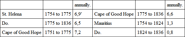 The annual amount of the change of the variation appears considerably greater at the Cape of Good Hope and Mauritius than at any other of Captain Fitz-Roy's stations, amounting to about eight minutes; shewing that the variation lines in that quarter are changing their position more rapidly than elsewhere. The north pole of the needle is moving to the west at the Cape, and to the east at Mauritius; but it will be seen, by a reference to the map, that these opposite movements are in perfect correspondence with the uniform westerly progression of the variation lines, and result from their configuration.