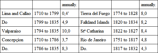 An almost equally simple generalization may be drawn in respect to the changes of situation of the lines of equal variation in the southern hemisphere: but here it must be supposed either that the reader is thoroughly familiar with the general arrangement of these lines, or that he has a map of them before him. He will find such a map of the variation lines in 1787 in the Fifth Report of the British Association; but any other map, corresponding to any epoch within the last hundred years, will equally serve the purpose. Referring to such a map, it will be seen that the lines of variation in the South Pacific, form a system of nearly concentric curves, of an oval, or pear-shaped form, the outside curves having a higher variation, which progressively diminishes to the centre. We may regard this system as comprehending the whole of the geographical space between the coast of South America and the meridian of New Zealand. Throughout this space the variation is easterly, and increases: we may consequently characterize the change in the situation of the lines of equal variation as a progressive closing-in of the curves from all sides towards the centre, by which the areas severally comprehended by them become less; and the lower variations, as they successively reach the centre, disappear, and are replaced by the closing-in of those of next higher amount. The changes which have taken place at all Captain Fitz-Roy's stations comprised within the space referred to, are accordant with the systematic alteration thus described.