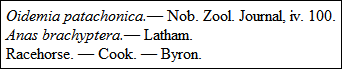 Molina describes a Chilian duck, anas coscoroba, thus: A. rostro extremo dilatato rotundato; corpore albo; but I do not think it can be the same as mine, or he would have noticed its red feet and bill. It certainly is not A. candidus, of Viellot; the ganso blanco of D'Azara, which the author of the article in the Dict. d'Hist. Nat. xxiii. supposes to be the one and the same with A. coscoroba. Molina gives but a short description of that bird.