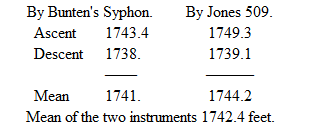 The changes of pressure, during the intervals of ascent and descent, were obtained by registering the ship's barometer, which was done by signal from the stations on shore, when the readings were taken. During the ascent the column fell 0.039 inches, and during the descent rose 0.041 inches. Corrections were made for the dew point, as observed by Daniell's hygrometer at the base and summit, and the calculations were made according to the formula in Daniell's Meteorological Essay.