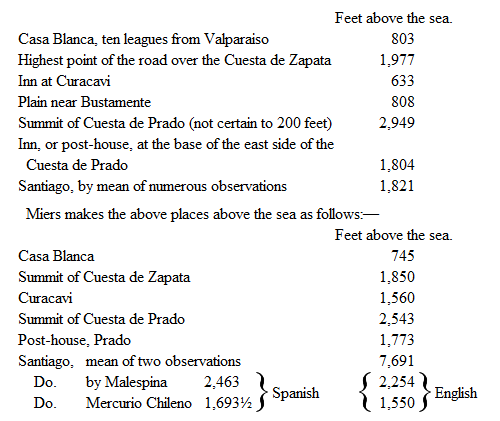 Miers, in his account of Chile, gives a table of barometrical measurements of the heights of the land between Valparaiso and Mendoza, from which it appears that he has deduced the height of Curacavi to be 1,560 feet. As my determinations are the results of observations made on my way to and from Santiago, I have no doubt of their correctness, and think that the registered height of Miers's table should be 29.355 instead of 28.355.