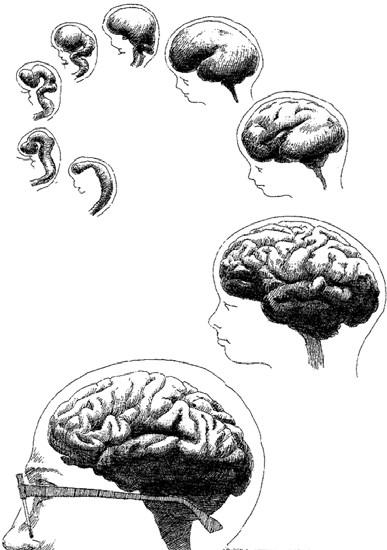 Конечно, нельзя сказать, что увеличение размеров мозга произошло лишь за последние несколько тысячелетий. Шестьдесят миллионов лет назад, в эоценовую эпоху, когда полуобезьяны (эволюционные предшественники обезьян и человека) жили на деревьях, размер мозга увеличивался постепенно. Возможно, это увеличение было связано с необходимым для навигации в пространстве улучшением зрения (что требовало обработки информации в мозге).